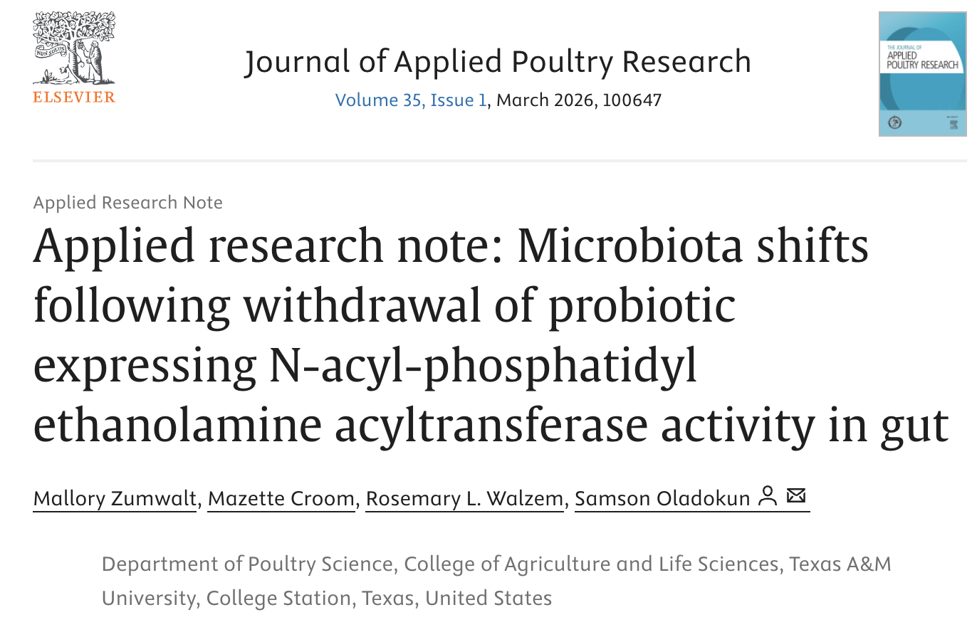 Congratulations to Mallory Zumwalt on her publication in the Journal of Applied Poultry Research.